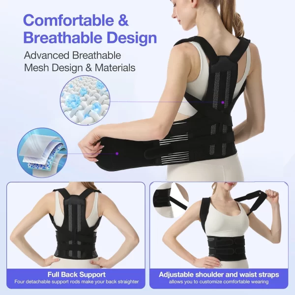 Corretor Postural 3 em 1: Nosso corretor postural ajustável para as costas, com design ergonômico, possui 4 barras de suporte flexíveis em ABS que oferecem suporte 3 em 1 para endireitar as costas, ombros e lombar. Não causa sensação de aperto nas axilas. O corretor postural melhora a postura de forma eficaz e pode aliviar dores nos ombros, cintura e pescoço quando usado por longos períodos. Ideal para trabalhadores de escritório, usuários de computador, bem como para pessoas em reabilitação ou recuperação.